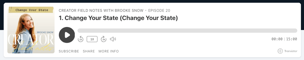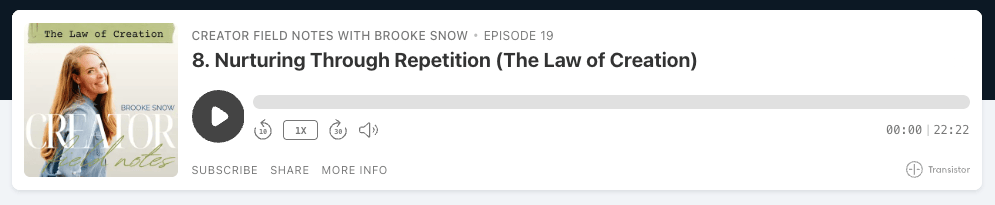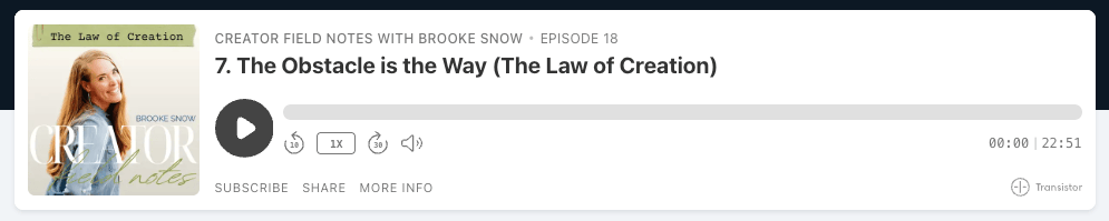 I am not a person who was addicted. Something as little as 15 minutes (or less!) was enough to get me off kilter. And I wasn’t aware of just how much until I experienced the contrast of having zero minutes, especially for several days in a row. I realize that my algorithm is most assuredly different than yours. It’s likely we’re not seeing the same content. What is more universal, however, is the amount of content we all receive in a day. And… It’s likely MORE content than is useful or beneficial to your life. For the past two decades, I’ve been on an information binge. ​ And what could be better than learning? How about learning at 2x the speed?!!! Oh my goodness! I could get through twice as many books or podcasts in half the time! Just speed everything up! I will never forget a Buddhist Sangha gathering I attended last year where the teacher spent an entire HOUR having us meditate on ONE SENTENCE. Can you imagine the contrast of a person like me who listened to all my content at 2X the speed, suddenly entering a moment where it was literally -3,000X slower? Ironically, that meditation was profoundly impactful for me. ​ I often forget that... Completion happens only when we fully integrate on the level of the heart and the body… Which requires us to pause and let things land. We have to slow down. Pausing can have many varieties. Everything from unplugging to literally taking a beat to breathe and invite the wisdom to come deeper. You already know this, but the internet is designed to capture your attention so you don’t pause. The best part of giving myself a break to pause this past week, has been hearing my own voice more than the voices of everyone else echoing in my mind. I feel human again. In all the inner work I’ve done for myself or working with clients, this tends to be one of those pivotal levers. If we want to find more inner peace, we will need to reclaim the sacredness of our attention. What are you giving your sacred attention to? If you had 15 minutes of sacred attention back in your day — where would you give it instead? If you were to create a nourishing pause, what would that look like for you? I’d love to hear your thoughts. Let me know in the comments, HERE.​ You are loved. Namaste, Brooke P.S. Speaking of speed…I made the decision to release The Creator Field Notes episodes three times a week instead of one. While it’s a faster release, here’s my invitation to enjoy at 1X :) This Week on Creator Field Notes... |